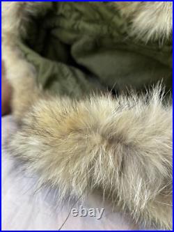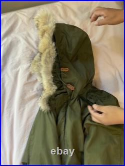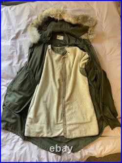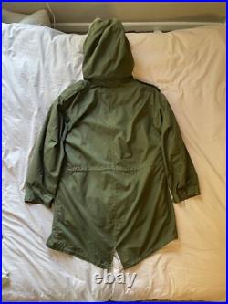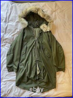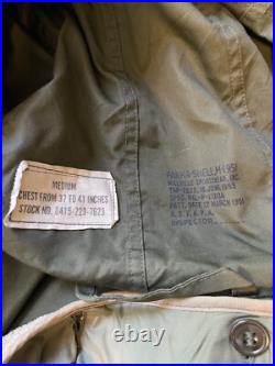Vintage Korean War M-51 Fishtail Parka - Size Medium - Military Surplus. Condition: New Never Issued - Vintage condition (see photos). Fit: Relaxed fit with adjustable drawstring waist and fishtail hem. Material: Cotton-Nylon Shell with Quilted Liner. Made In: USA (1950s-era military issue).