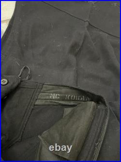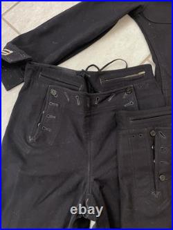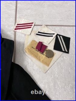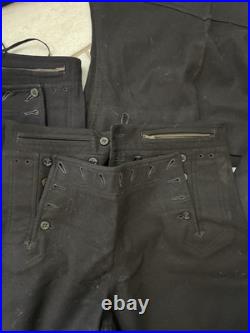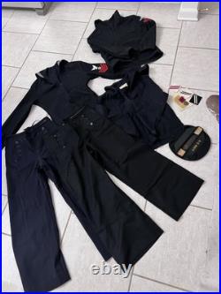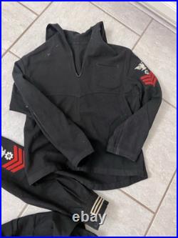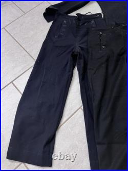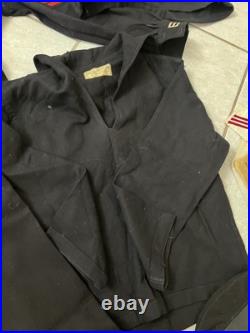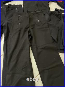 3 tops, two pants, hat, and medal with patches. All appear to be in good condition just need to be cleaned they have some dog hair and dust. They do not have a strong smell. All items appear to be an overall good condition with Minor blemishes.