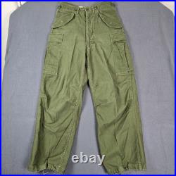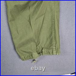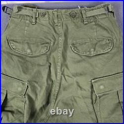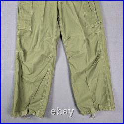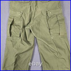 The product is a pair of original vintage men's P-1951 Korean War US Army cargo field sateen pants trousers from the 1950s in small size. These trousers are authentic military gear from the Korean War era, making them a valuable addition to any collection focusing on militaria items.